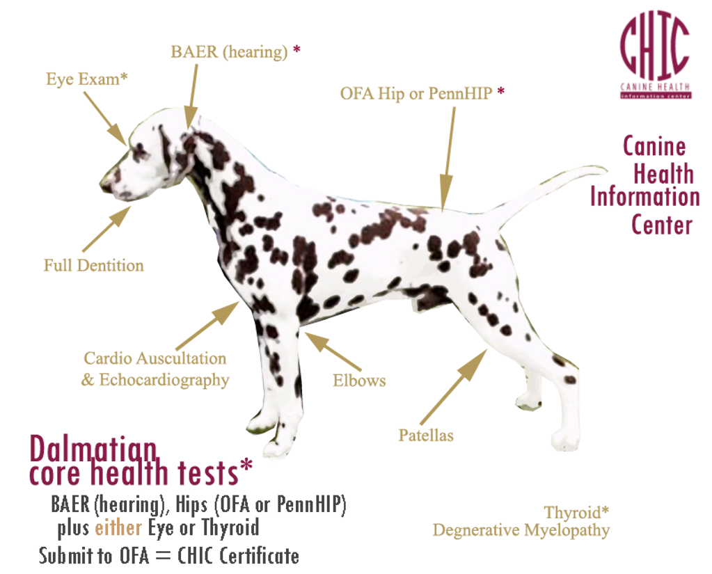 Our dogs achieve CHIC Certification once they have been screened for every disease recommended and those results are publicly available in the OFA database. As more DNA tests become available and the results are entered, the OFA database will be able to establish whether progeny will be clear, carriers, or affected.
